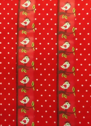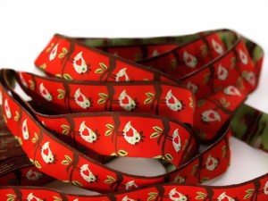 In den WarenkorbWebband mit süssen Eulen 16 mm breit Untergrund rot Farbe hellgrün